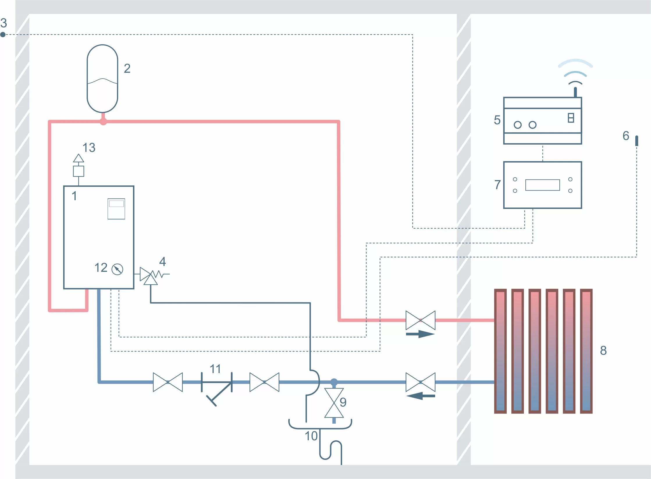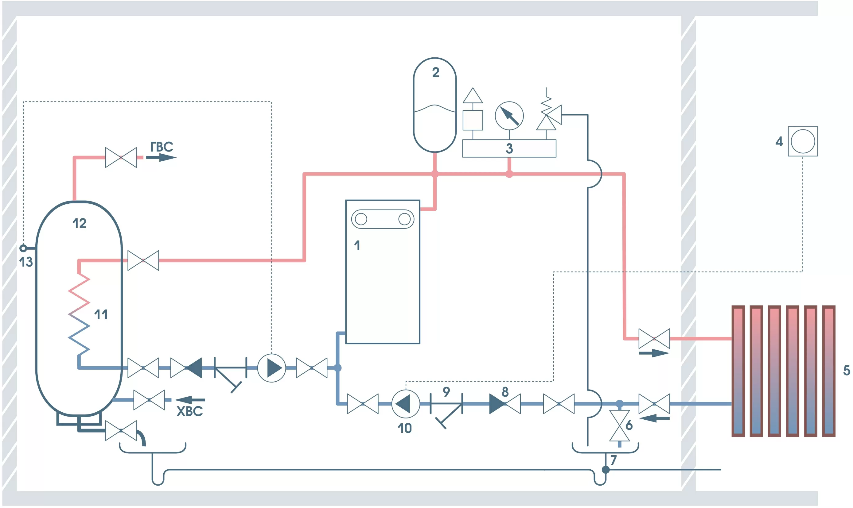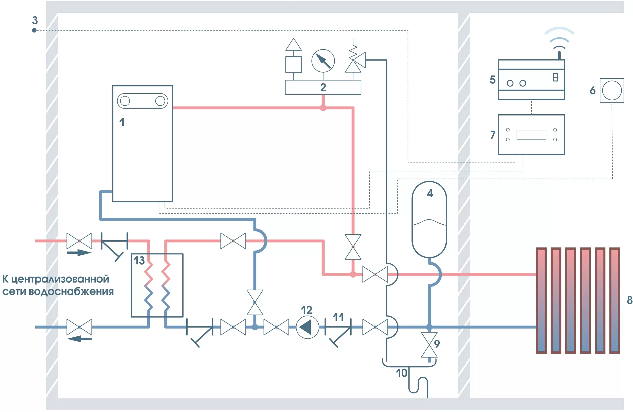 8. Система отопления 9. Вентиль для слива теплоносителя 10. Слив 11. Косой фильтр (грязевик) 12. Циркуляционный насос 13. Пластинчатый теплообменник |