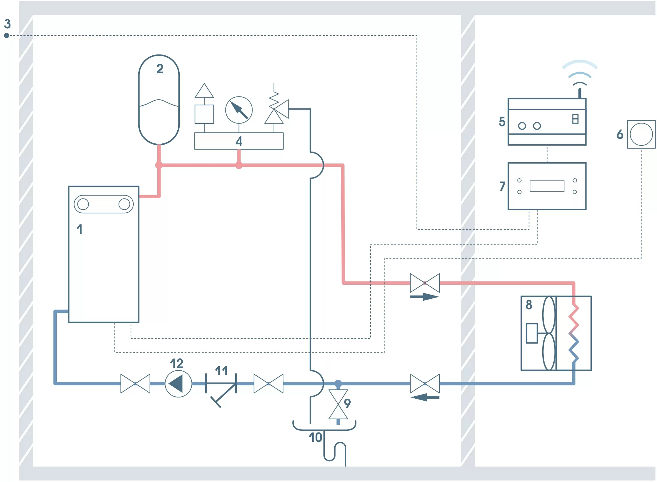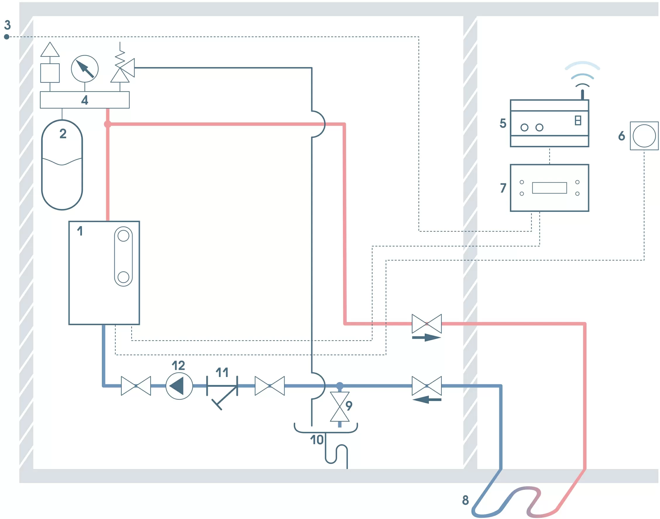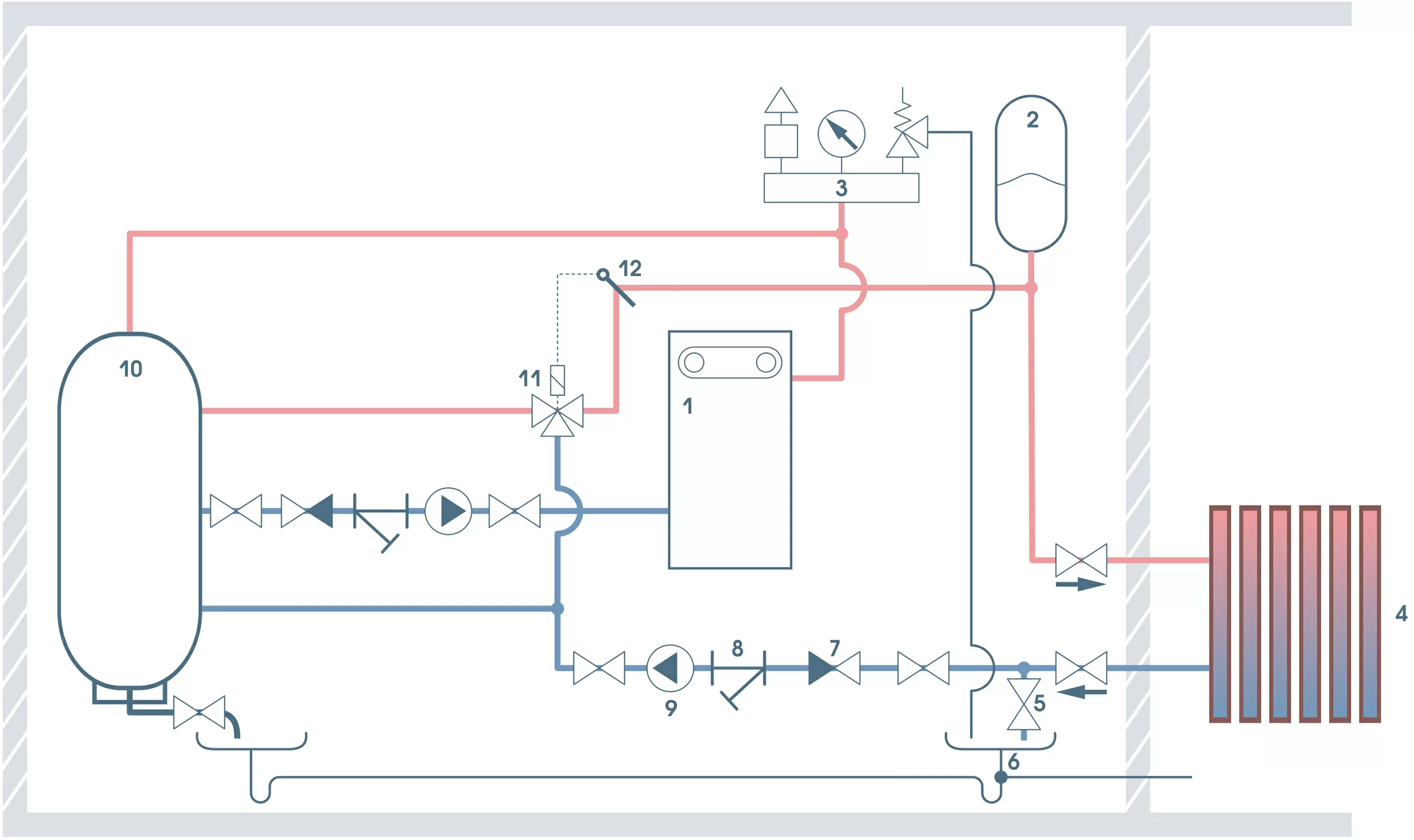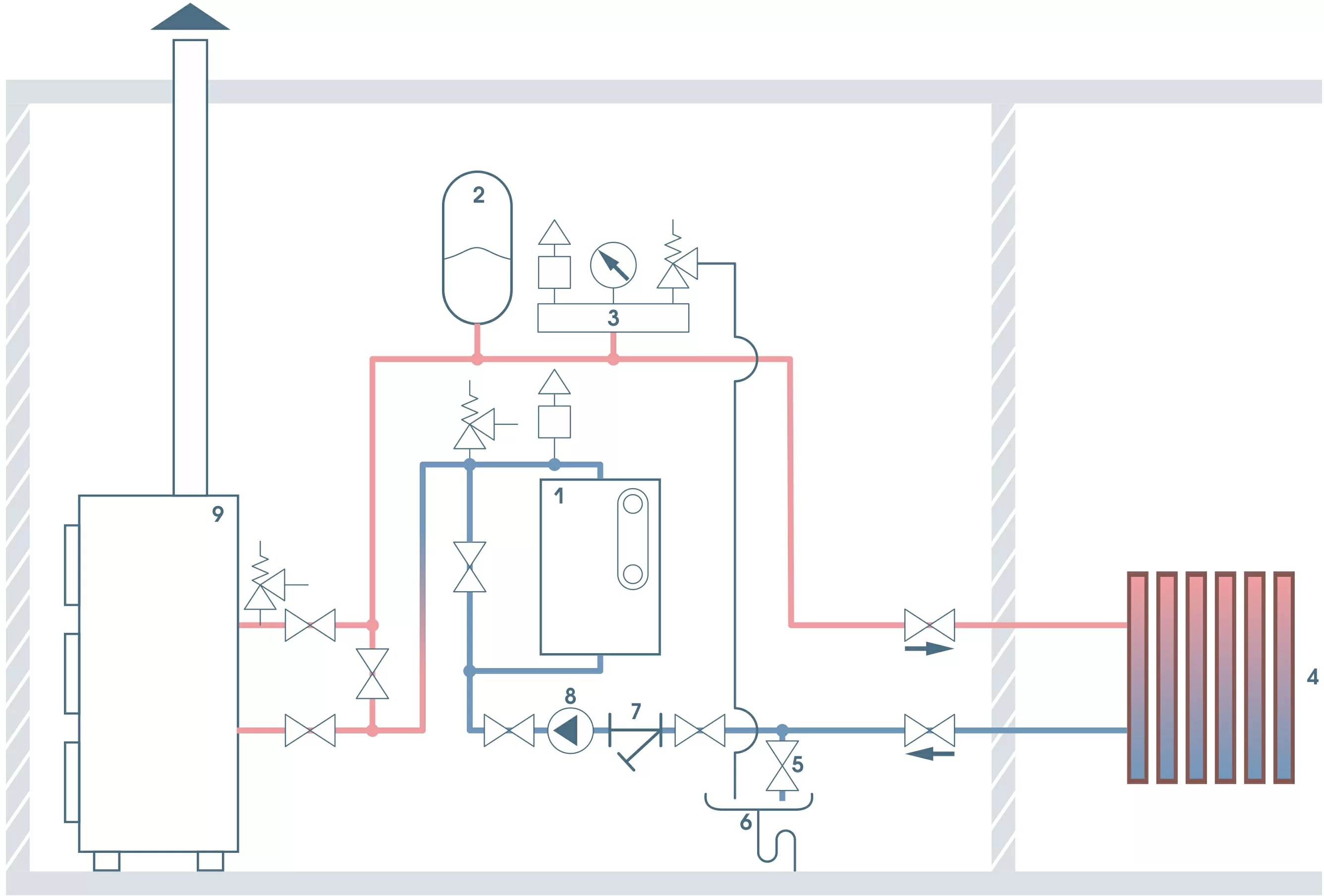 8. Система отопления 9. Вентиль для слива теплоносителя 10. Слив 11. Косой фильтр (грязевик) 12. Циркуляционный насос 13. Пластинчатый теплообменник |